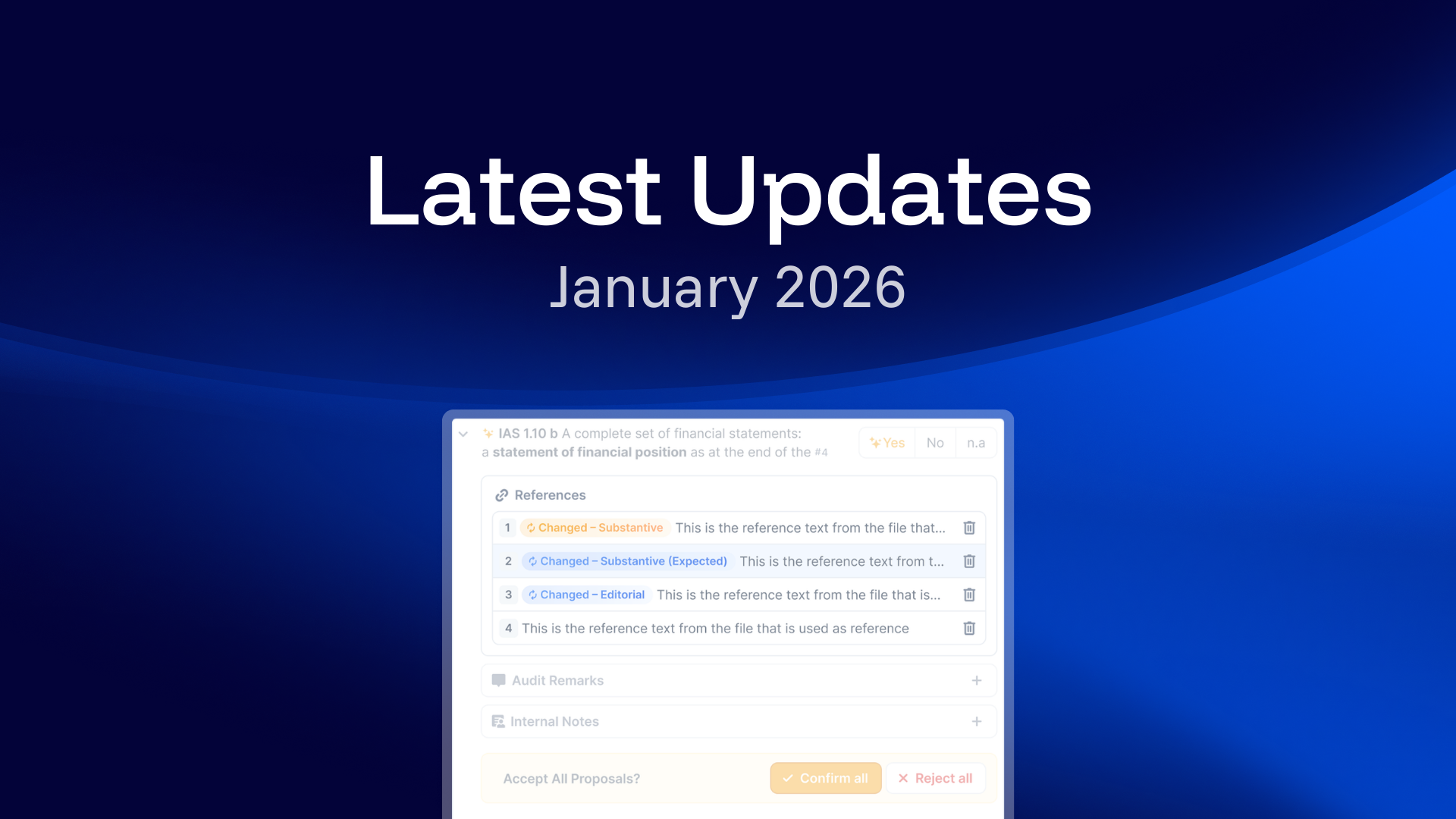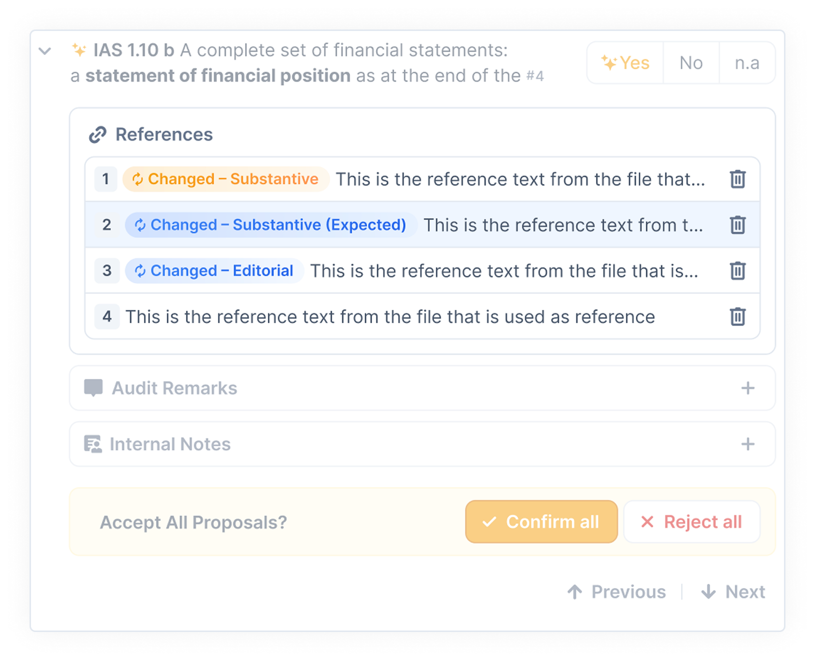 The AI provides more context-aware results when comparing changes in references — whether a template is used or a new version is uploaded. It distinguishes between editorial, expected substantive, and unexpected substantive changes. This brings more focus to relevant updates and keeps all detected modifications transparent and easy to review.
